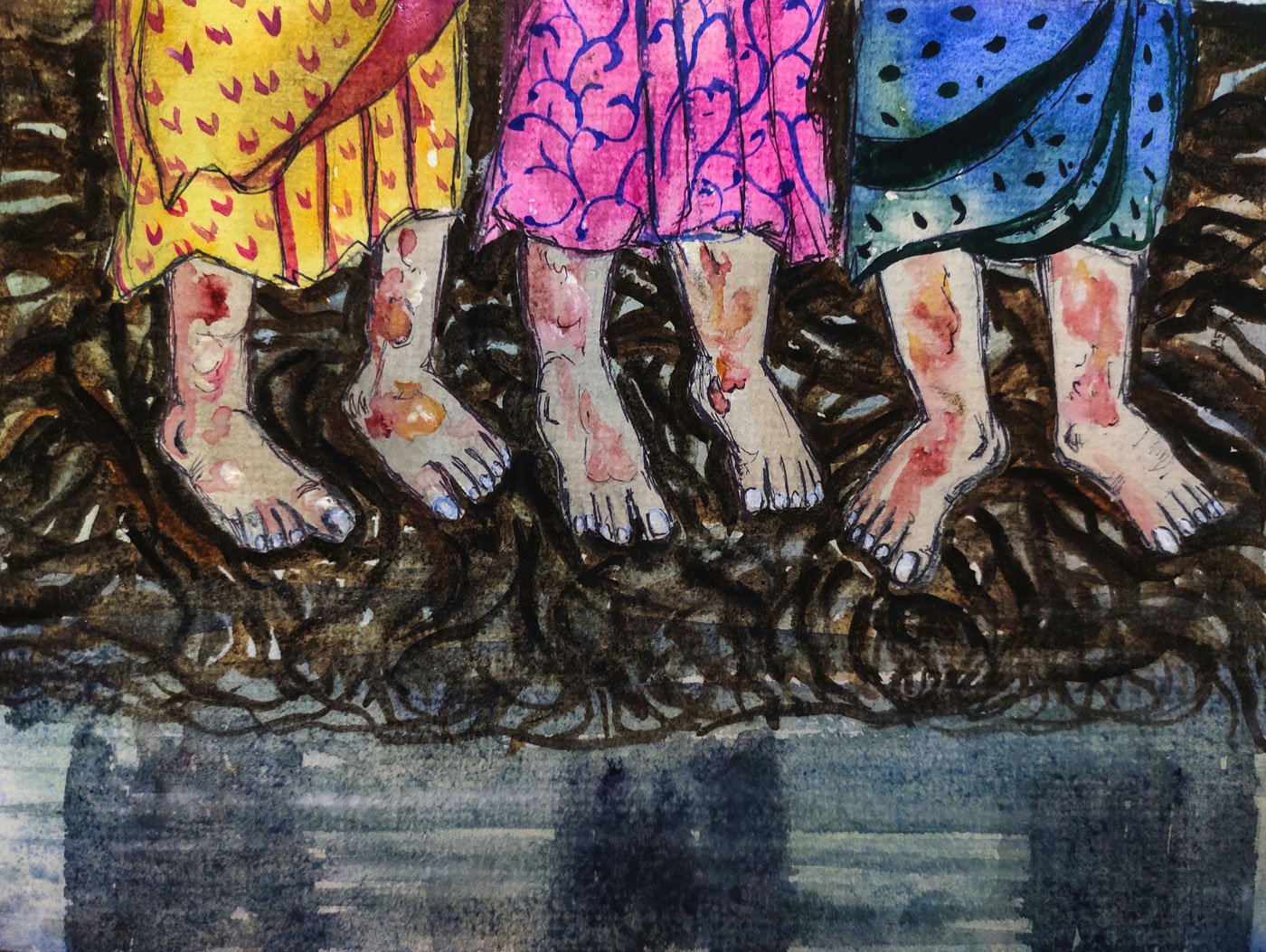 మీనూ నివసించే ప్రదేశానికి 10 కిలోమీటర్ల కంటే తక్కువ దూరంలో ఉన్న రజత్ జూబ్లీ గ్రామానికి చెందిన 51 ఏళ్ల ఆలాపి మండల్ సరిగ్గా ఇలాంటి కథనే వివరించారు. “మూడు నాలుగు సంవత్సరాల క్రితం, నేను నా చర్మం అంతటా తీవ్రమైన దురదతో బాధపడ్డాను. ఒకోసారి ఈ వ్యాధి ఎంత తీవ్రంగా ఉండేదంటే, చీము బయటకు వచ్చేది. ఇదే సమస్యను ఎదుర్కొన్న అనేక మంది మహిళలు నాకు తెలుసు. ఒకానొక సమయంలో, మా గ్రామంలోనూ, చుట్టుపక్కల గ్రామాల్లోనూ ప్రతి కుటుంబంలో చర్మవ్యాధి సోకినవారు ఉన్నారు. ఇది ఒక రకమైన వైరస్ అని డాక్టర్ నాకు చెప్పారు."