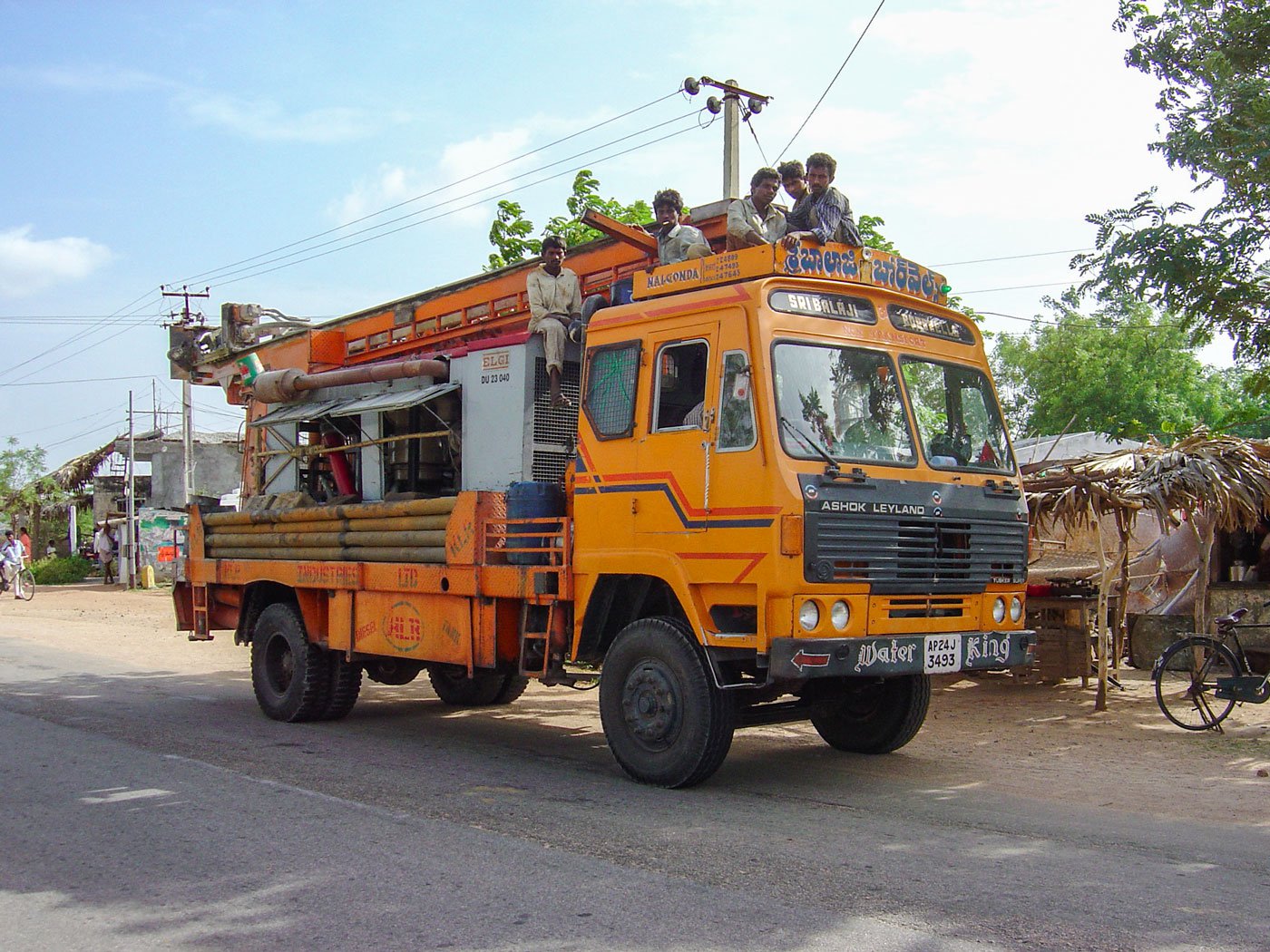 ജലക്ഷാമം നേരിടുന്ന പ്രദേശങ്ങളിൽ ചുറ്റിക്കറങ്ങുന്ന കുഴൽക്കിണർ കുഴിക്കുന്ന റിഗ്ഗുകൾ