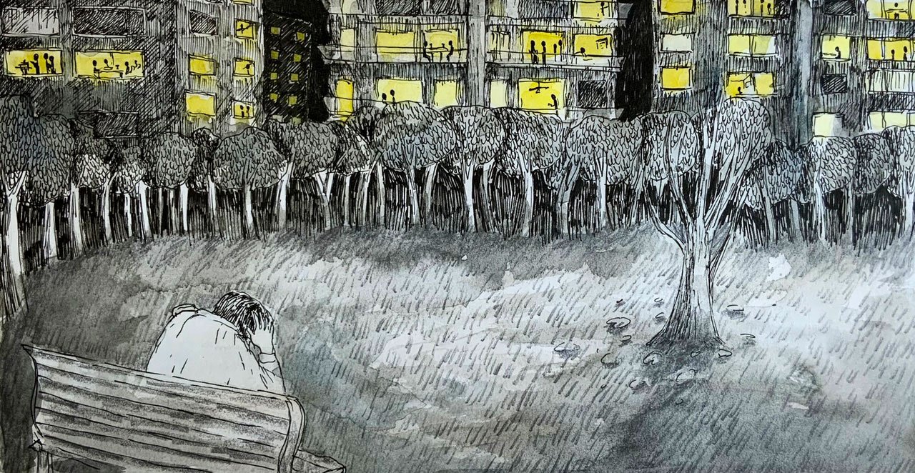At dusk, he walked into the abandoned garden. Sat down on a bench, and placed a big stick and a small phone beside him. The garden was silent for a second time within a year. Children and adults were all once again locked away in their homes.